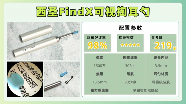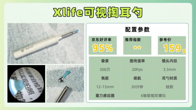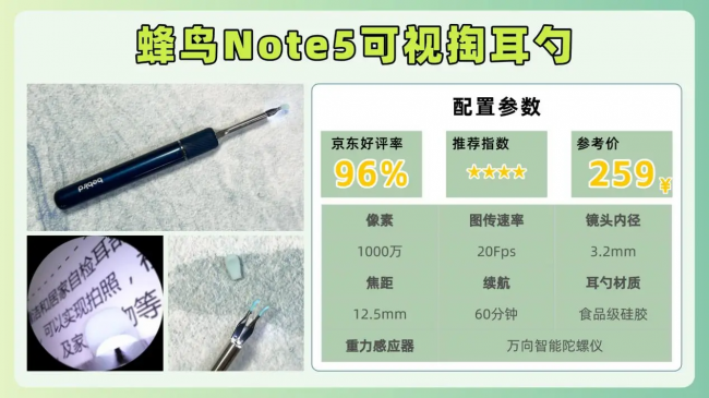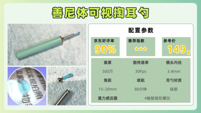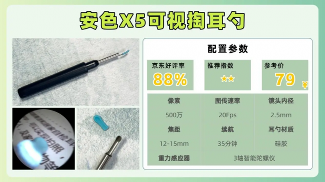 核心数据:800万像素,续航35分钟,硅胶耳勺头(不可拆卸),LED补光灯,WiFi连接,机身防滑设计