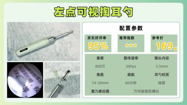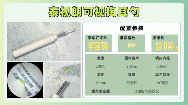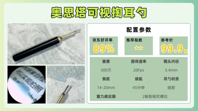 核心数据:800万像素,续航60分钟,硅胶耳勺头(耳镊一体式),内置柔光LED灯,WiFi连接,支持拍照/录像