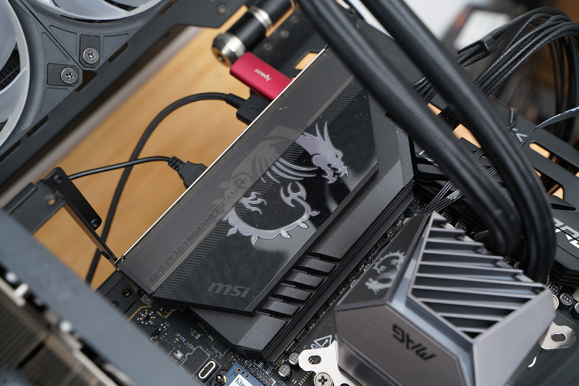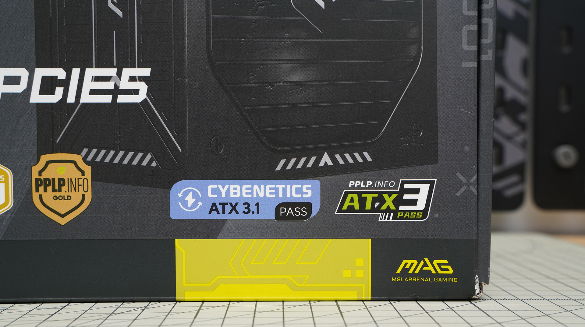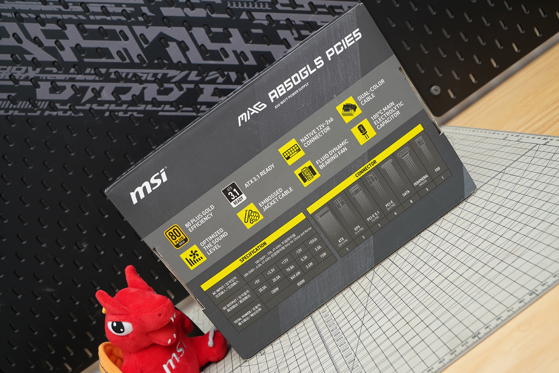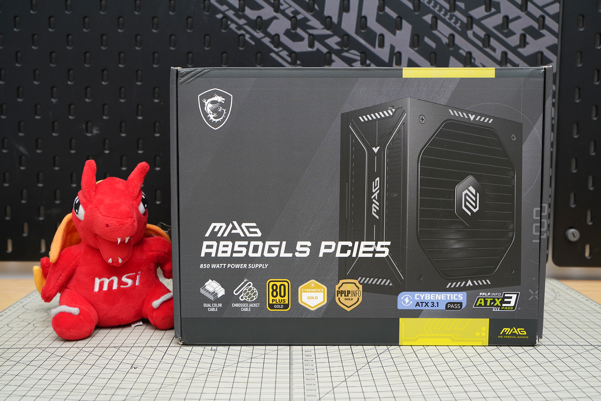 MSI MAG A850GLS PCIE5的外包装延续了电竞硬朗风格,以黑灰配色搭配装甲化线条设计,正面印有电源大幅渲染图与醒目的龙盾LOGO,整体质感突出。底部集中展示80PLUS金牌、CybeneticsGold、ATX3.1与PCIe5.0支持等关键信息,同时点出压纹线材、双色线缆等实用卖点,清晰传达其在供电规格与品质方面的优势。右下角的MAG系列标识进一步强化其游戏与高性能定位,可谓信息完整、辨识度高且风格统一。