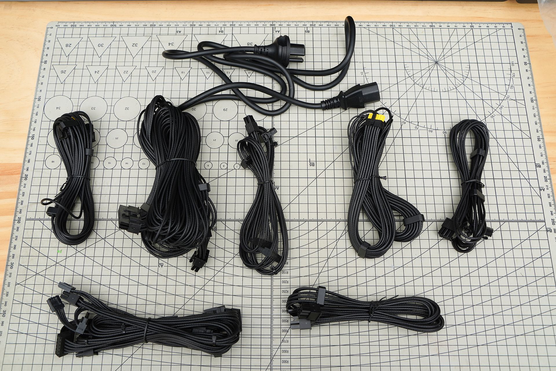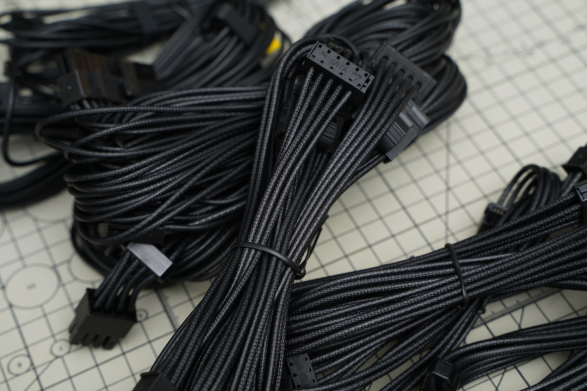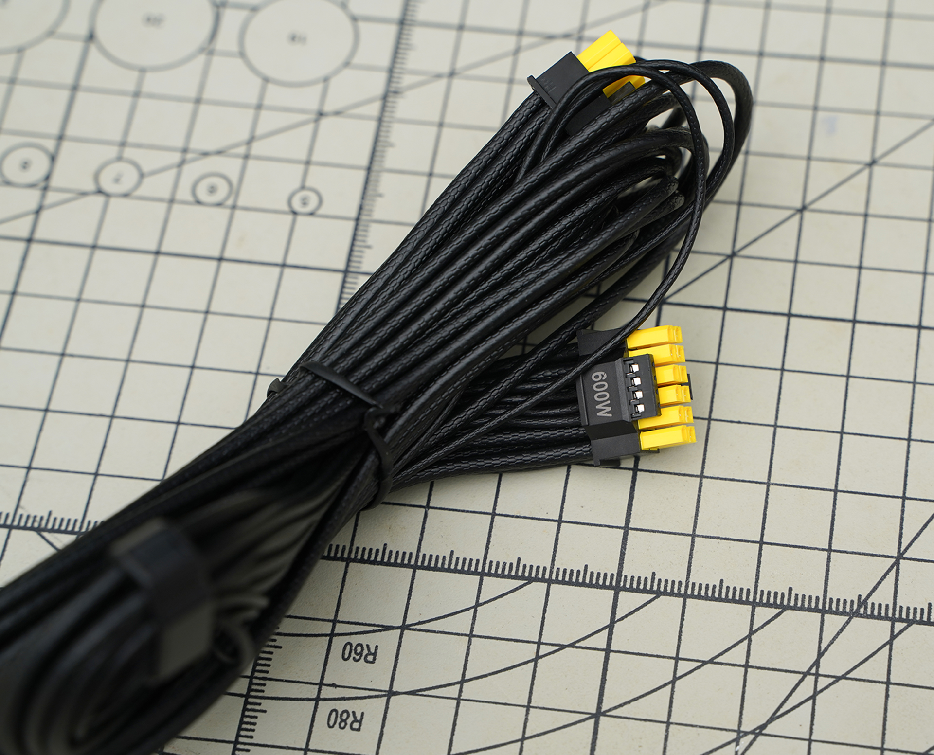 这套模组线采用黑色压纹外皮设计,线材柔韧易走线,整体观感更整洁。线材从导体到外层均通过 UL 认证,具备更高耐温与阻燃性;端子部分为 铜合金材质,提升电流承载能力与长期稳定性。接口数量完整:包含1个24Pin主板供电、2个EPS供电、1个支持最高600W输出的PCI-E5.1原生显卡供电、4个PCI-E、7个SATA与3个MOLEX,全面满足高端平台扩展需求,做工扎实、规格到位。