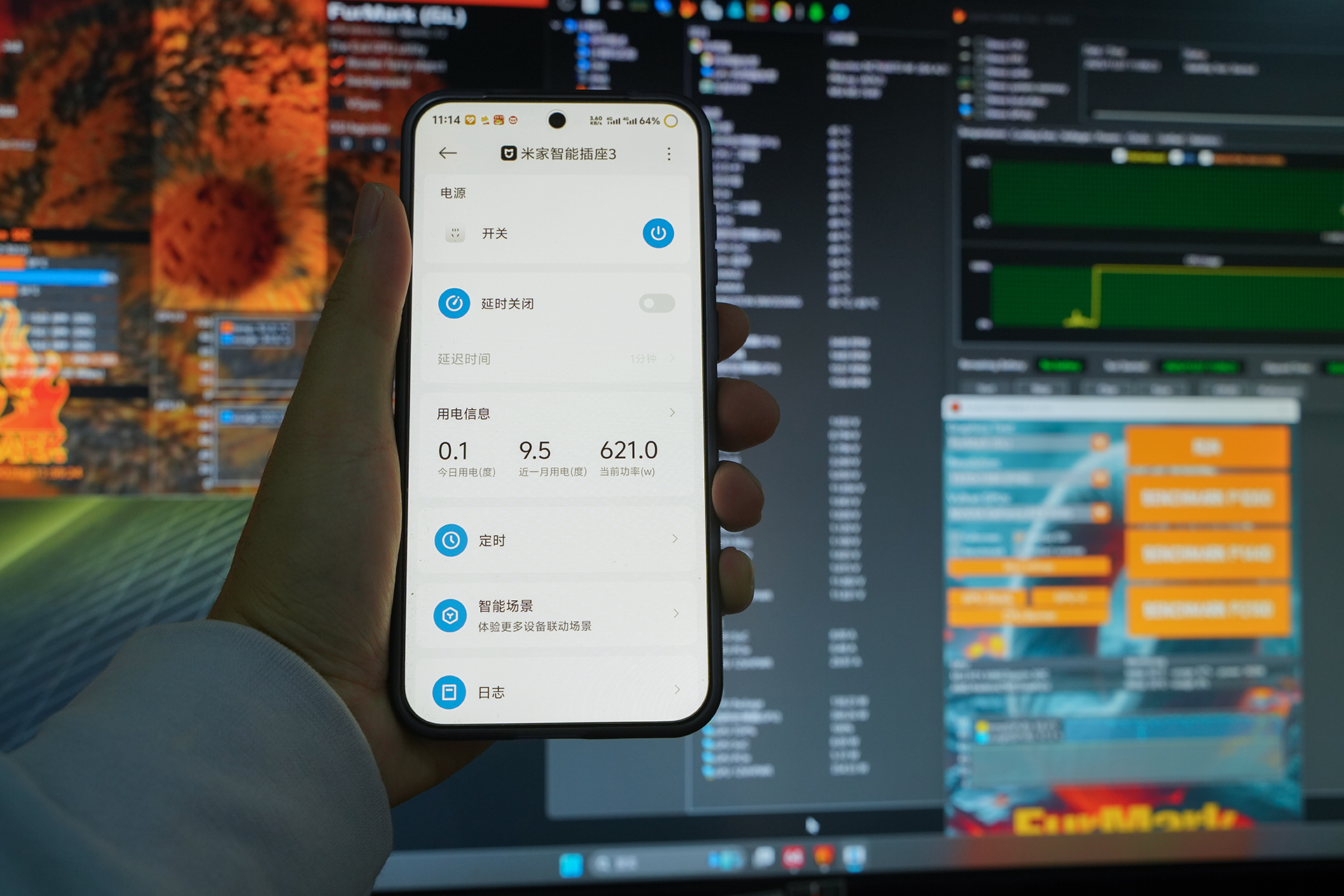 使用AIDA64单FPU+FURMARK双烤整机,此时从小米插座能看到整机功耗高达621W。