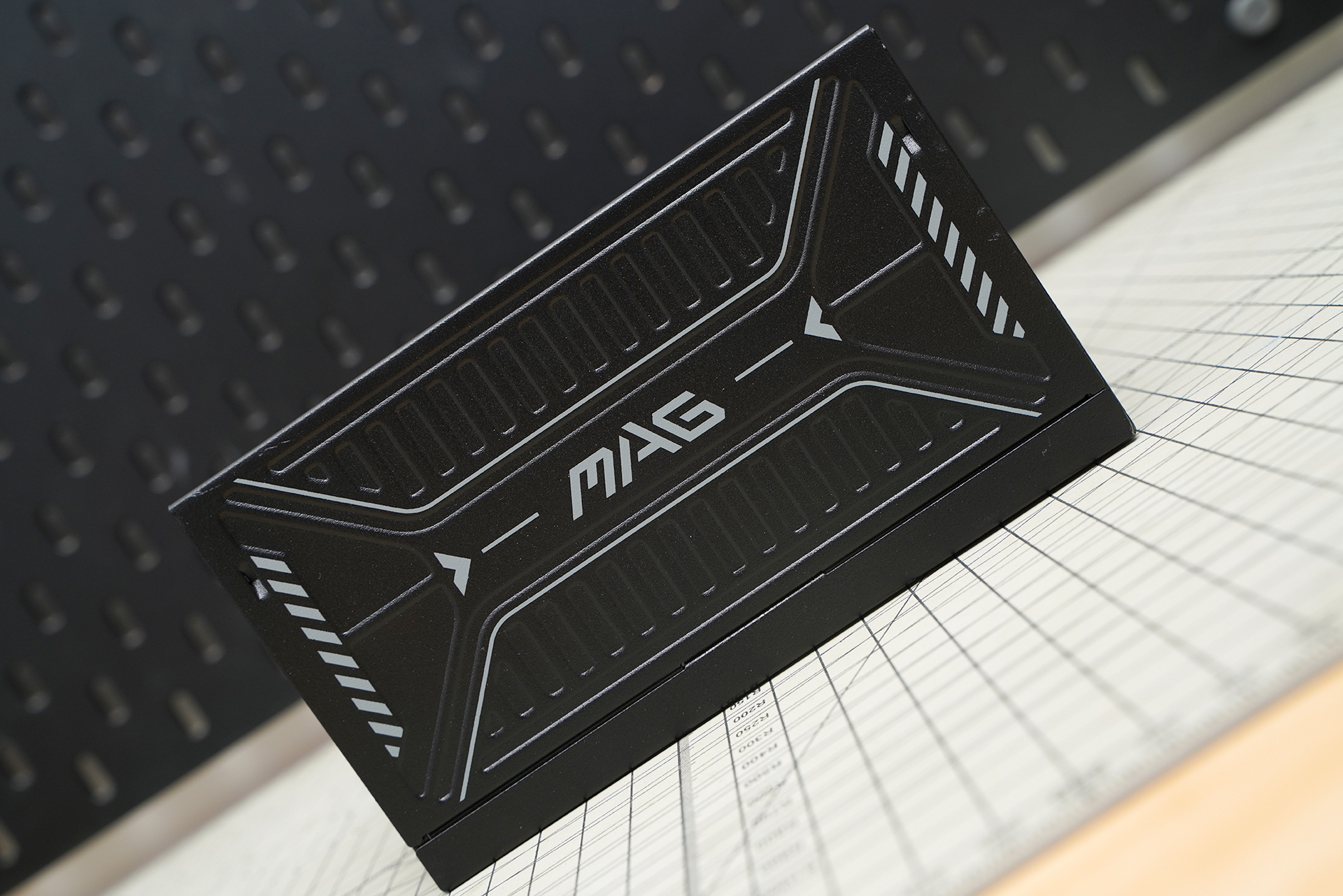 电源的三维尺寸为150x150x86mm,外观采用全黑配色搭配立体纹理与箭头式装甲化装饰,呈现出典型 MAG 系列的电竞工业风。侧面印有醒目的 MAG 标识,适合侧透机箱展示,整体质感硬朗,辨识度也相当高。
