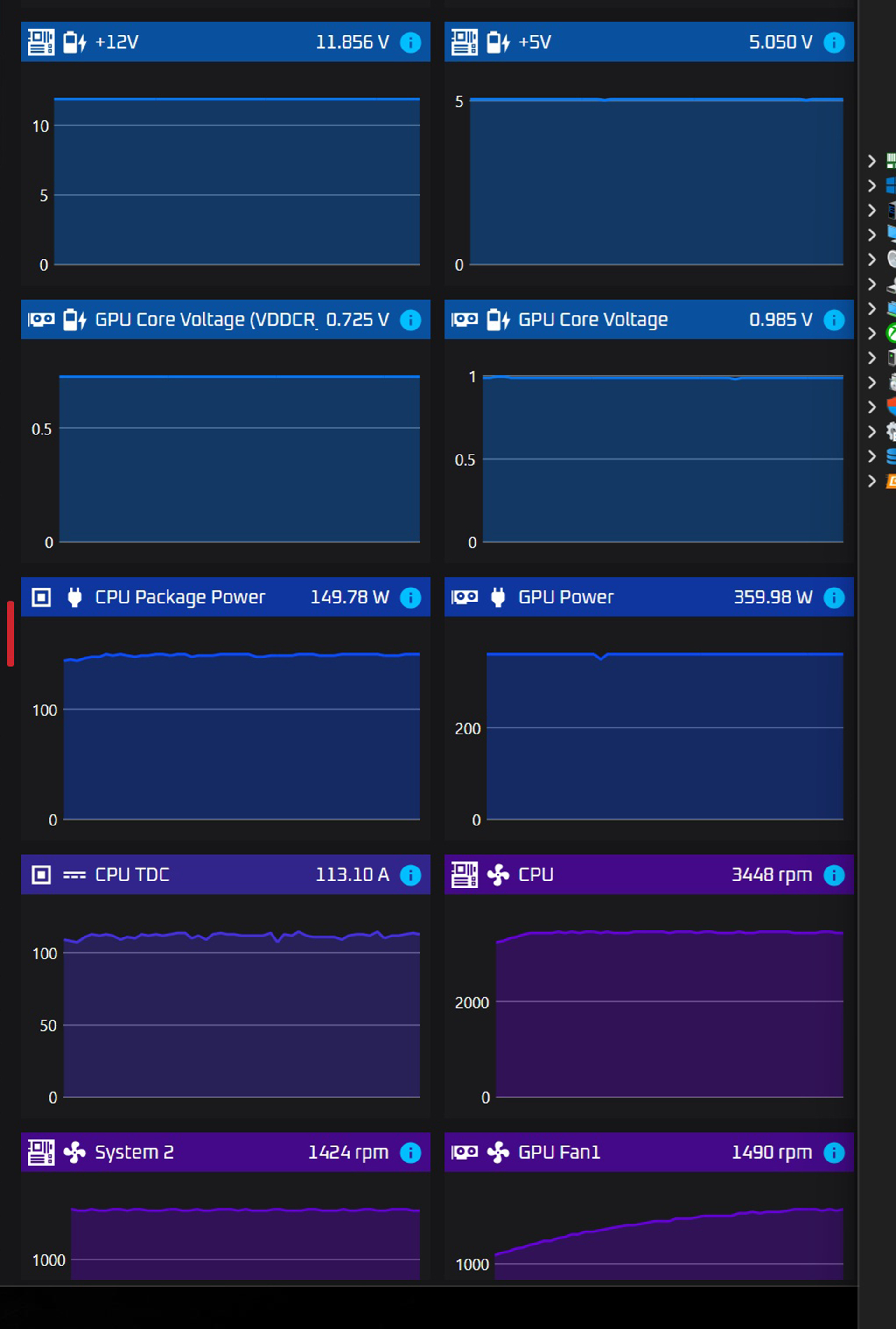 此时电源功率大约运行在70%~75%区间,属于效率表现较佳、且对电源压力健康可控的负载水平。使用OCCT软件对电源12V\5V供电进行监控,整体曲线平稳无明显波动,说明MAG A850GLS PCIE5在大电流输出场景下依旧具备良好的稳压能力,能够持续为CPU与GPU提供可靠供电,展现出高品质电源应有的稳定表现。