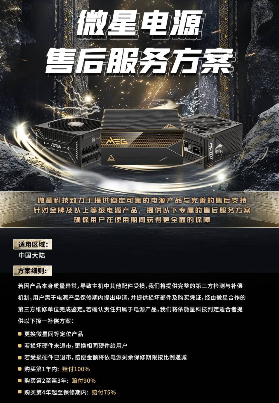 作为一款售价不到500元的850W ATX3.1电源,微星MAG A850GLS PCIE5兼顾了用料与规格:80PLUS金牌效率、原生12V-2x6显卡供电、全模组线材、稳定的输出表现以及偏硬朗的电竞外观,让它在同价位产品中竞争力十足。更值得一提的是,微星为金牌及以上电源产品提供了完善的售后保障——若因电源本体异常导致主机硬件损坏,可按第三方检测结果提供配件赔偿,第一年至第三年赔付比例最高可达100%-90%,第四年至第六年仍可享受75%的保修补偿,保障力度在同级市场中相当亮眼。对于预算有限又追求长期稳定性的玩家来说,这款电源无疑是一个放心、稳妥且性价比非常高的选择。