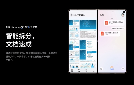 更大的屏幕如果没有生态支持,便只是尺寸的简单放大。华为鸿蒙生态则让折叠屏实现了从“大屏沉浸”到“分屏高效”的体验跃迁。具体而言,借助智慧分屏、悬浮多窗等功能,用户可在移动办公场景中轻松实现多任务并行处理:例如左屏参与视频会议,右屏同步记录要点;或上半屏查阅资料,下半屏同步编辑文档——这种高效协同的工作流,是传统直板机受限于屏幕形态所难以企及的。