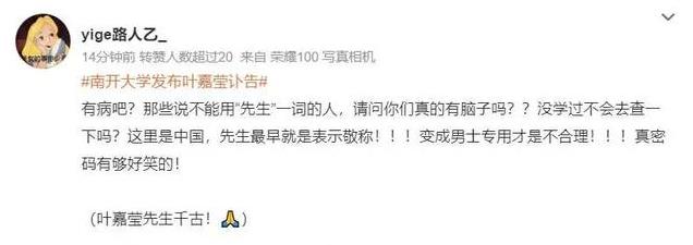 这里再多说一点,那些口口声声说“请不要称女性为先生”的人,你们有没有想过要尊重叶嘉莹老师自己的用法?