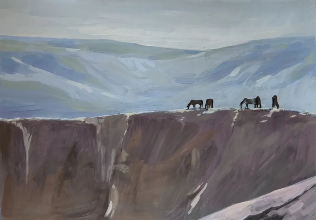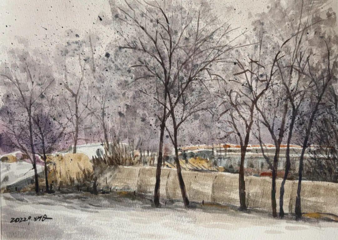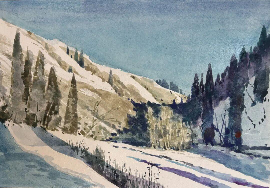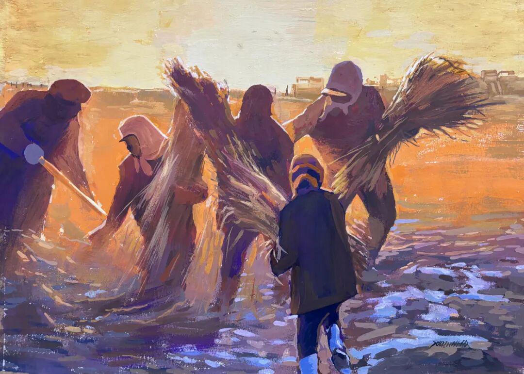 农民的丰收场景,村庄的乡情眷恋,伊犁河谷的异域风情、高原山峦的本真,在他的画里成为记录新疆地域文化、传递西北人文魅力载体,是技法的专业性与情感的人文性完美结合的新经典。在题材上他有西域题材的宏大笔触,也以微观视角切入的细腻,实现了对地域元素的物理性和生活性的全景呈现。水粉的通透、水彩的晕染、丙烯的厚重,皆可构建层次质感,有写实主义的精准,也有表现主义的情感温度。对山河土地的眷恋、对生命生存的思考与现实风物如影相随,如歌回响。他的画有形质美,也完具思想美的精深内涵。