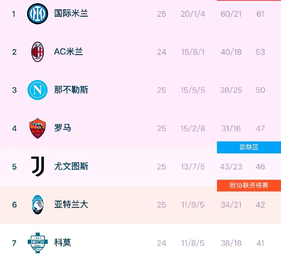 尤文图斯情况很糟糕,对它,不但拿前四是硬任务,还要打欧冠附加赛,和国米一样是打双线,而本赛季罗马表现意外的出色,积分已经爬过了尤文的前头,他的防守丢球数意甲最佳,像这样的球队是很难追敢的,加上背后小法的攻势足球科莫,目前也是被双线困住的亚特兰大,尤文的压力已经很迫切了。