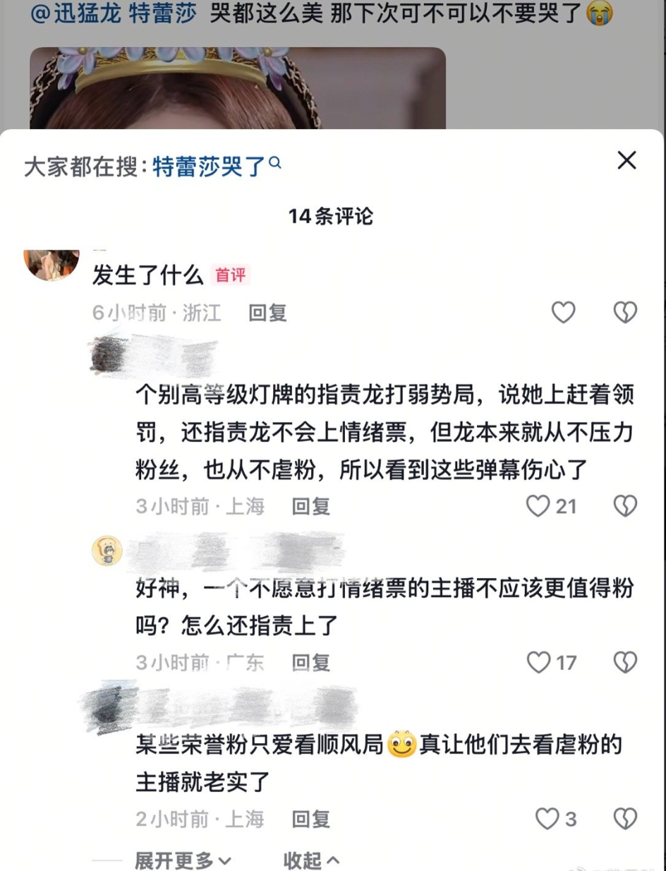 11月27日直播中,部分持有高级灯牌的粉丝公屏刷屏批评迅猛龙,导致迅猛龙崩溃落泪。