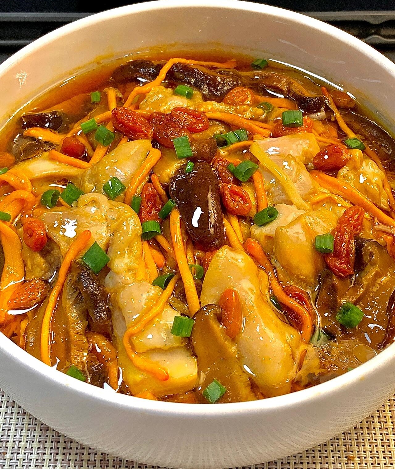 时间一到,关火焖两分钟再开盖。这时候你会看到盘子里积了一层金灿灿的鸡汤,虫草花吸饱了汁水变得饱满油润,鸡肉泛着诱人的光泽。先别急着吃,撒上切好的葱花,淋一勺滚烫的热油——"滋啦"一声,葱香瞬间被激发出来,整个厨房都香得让人站不住脚。
