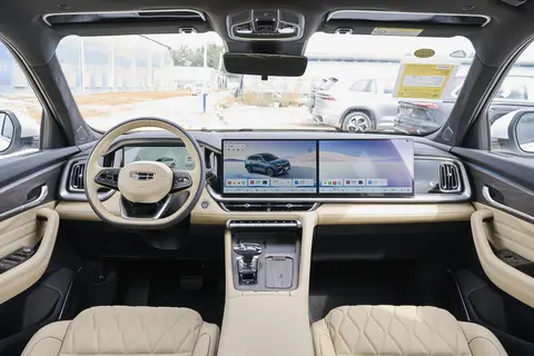 作为中高配车型,揽星版的智能科技配置堪称越级。它搭载了 GEEA3.0 电子电气架构与高通骁龙 8155 芯片,车机系统的流畅度堪比高端智能手机,操作时几乎没有卡顿。车内配备双 14.6 英寸中控屏、12.3 英寸全液晶仪表与 25.6 英寸 AR-HUD 抬头显示,组成四屏联动的交互生态,其中双中控屏支持三指滑屏,副驾能独立控制娱乐内容,主驾则可通过仪表与 AR-HUD 清晰获取行车信息。车机搭载的 Flyme Auto 系统,内置高德 AR 导航、华为 HiCar 互联,还有丰富的应用生态,语音助手支持分区域唤醒,比如后排乘客无需动手,直接用语音就能调节空调温度,使用很便捷。