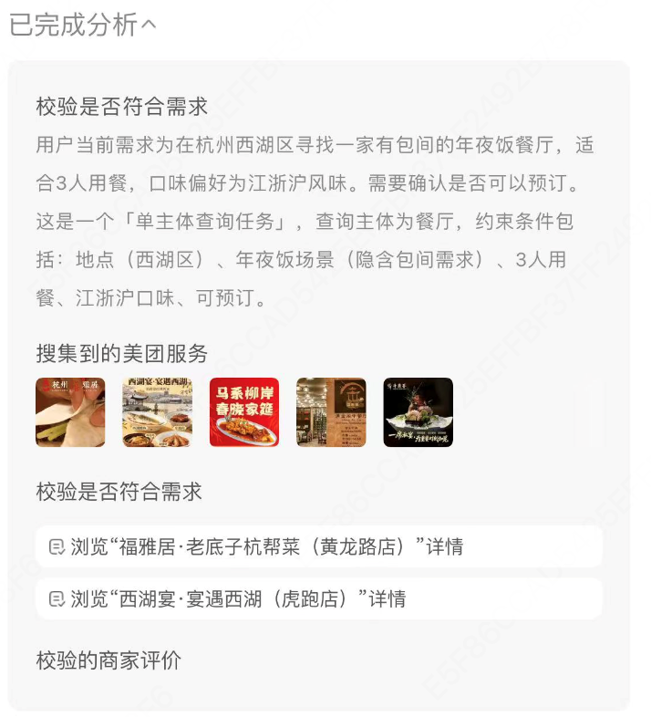 我们进行了两次测试,“小团”输出结果的过程包括“搜索美团信息及服务”“校准是否符合需求”“校验商家评价”三个阶段。