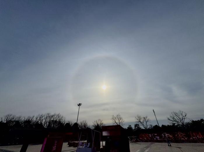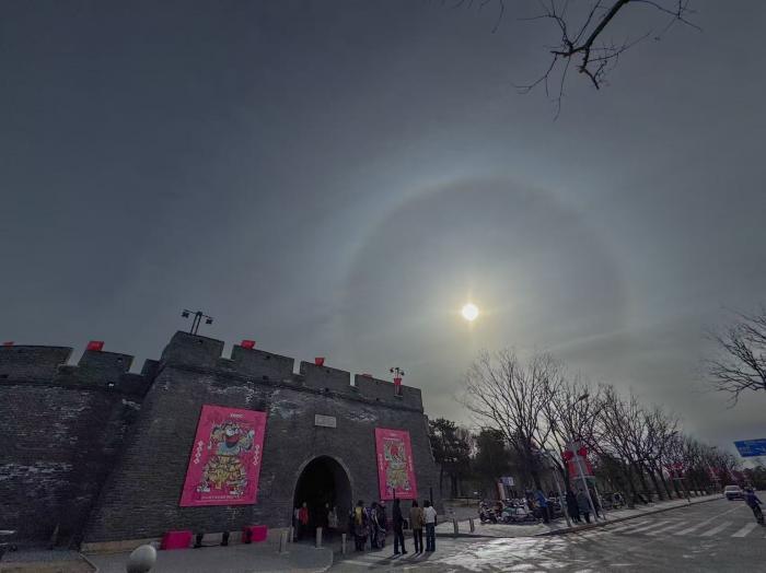 2月15日清晨,北京上空出现日晕天象,巨大的彩色光环环绕太阳,引得市民驻足观赏、拍照留念。