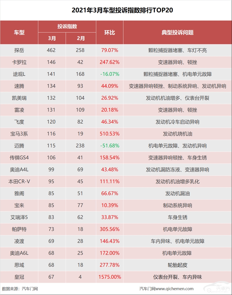 二、有哪些车型的购买我们需要谨慎,投诉较多的车型,一汽-大众探岳和速腾车型、上汽大众旗下品牌途观L、一汽丰田卡罗拉、广汽丰田凯美瑞和雷凌、广汽本田位飞度和雅阁、一汽奥迪奥迪A4L、奥迪Q5、奇瑞汽车艾瑞泽5和瑞虎8、吉利缤越、长城哈弗H6、长安逸动、广汽传祺传祺GS4、江淮汽车嘉悦A5,这些车型的投诉问题也都不同。