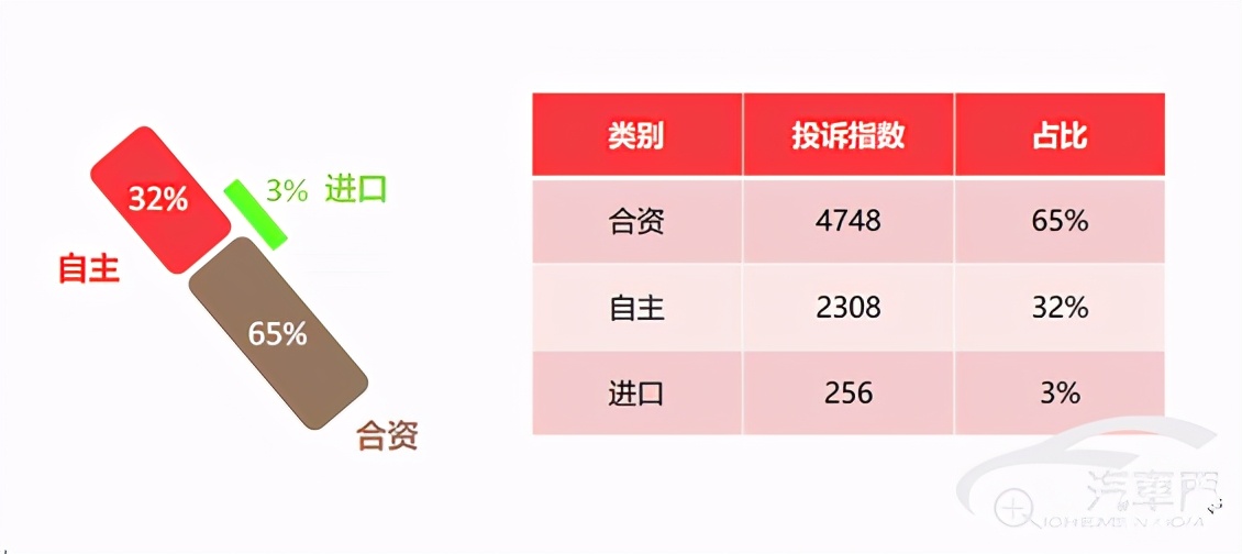 3、车企类别投诉指数中,合资车型占据65%的高份额,位列前三的车企分别是一汽-大众、上汽大众和一汽丰田;自主品牌投诉量占比32%,投诉前三名车企分别为奇瑞汽车、吉利汽车和长城汽车。