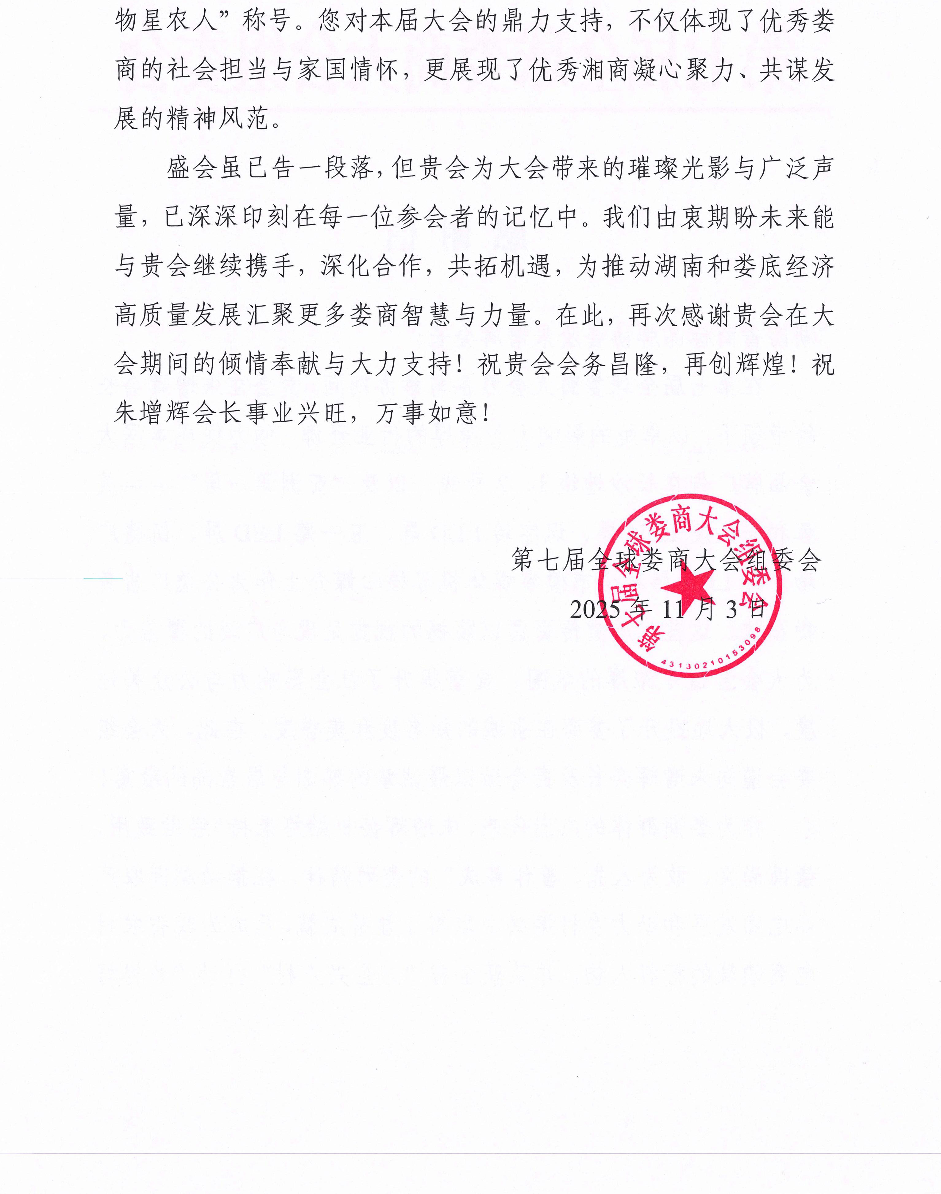 朱增辉会长收到第七届全球娄商大会组委会感谢信