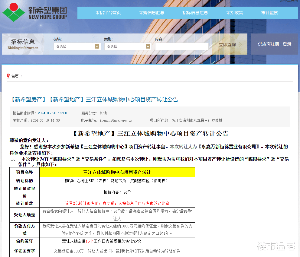 2024年5月,新希望集团曾发布《三江立体城购物中心项目资产转让公告》。公告称,该项资产总建筑面积约72841.39㎡,配套车位位于地下负一层,设置2亿转让参考价。