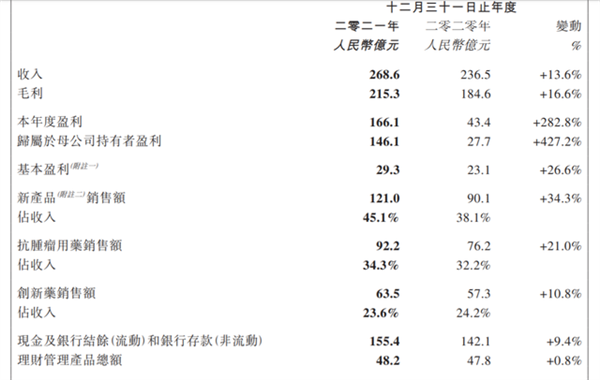 3月31日,中国生物制药有限公司(中国生物制药)发布了2021年年报,收入268.6亿元,同比(较上年同期)增长13.6%;毛利215.3亿元,同比增长16.6%;归属于母公司持有者盈利146.1亿元,同比增长427.2%。
