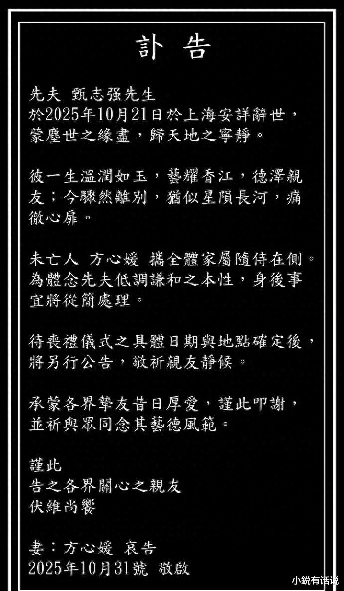 从讣告中可以看到,甄志强在10月21日就已经离世。但家属一直没有公开离世的新闻。目前,甄志强的丧礼还暂时没有举行,之后家属会再度进行公布。