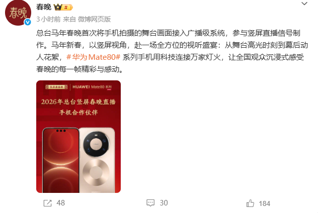 日前, @春晚 官宣了预热海报,并配文称,“总台马年春晚首次将手机拍摄的舞台画面接入广播级系统,参与竖屏直播信号制作。马年新春,以竖屏视角,赴一场全方位的视听盛宴:从舞台高光时刻到幕后动人花絮,#华为Mate80# 系列手机用科技连接万家灯火,让全国观众沉浸式感受春晚的每一帧精彩与感动。”