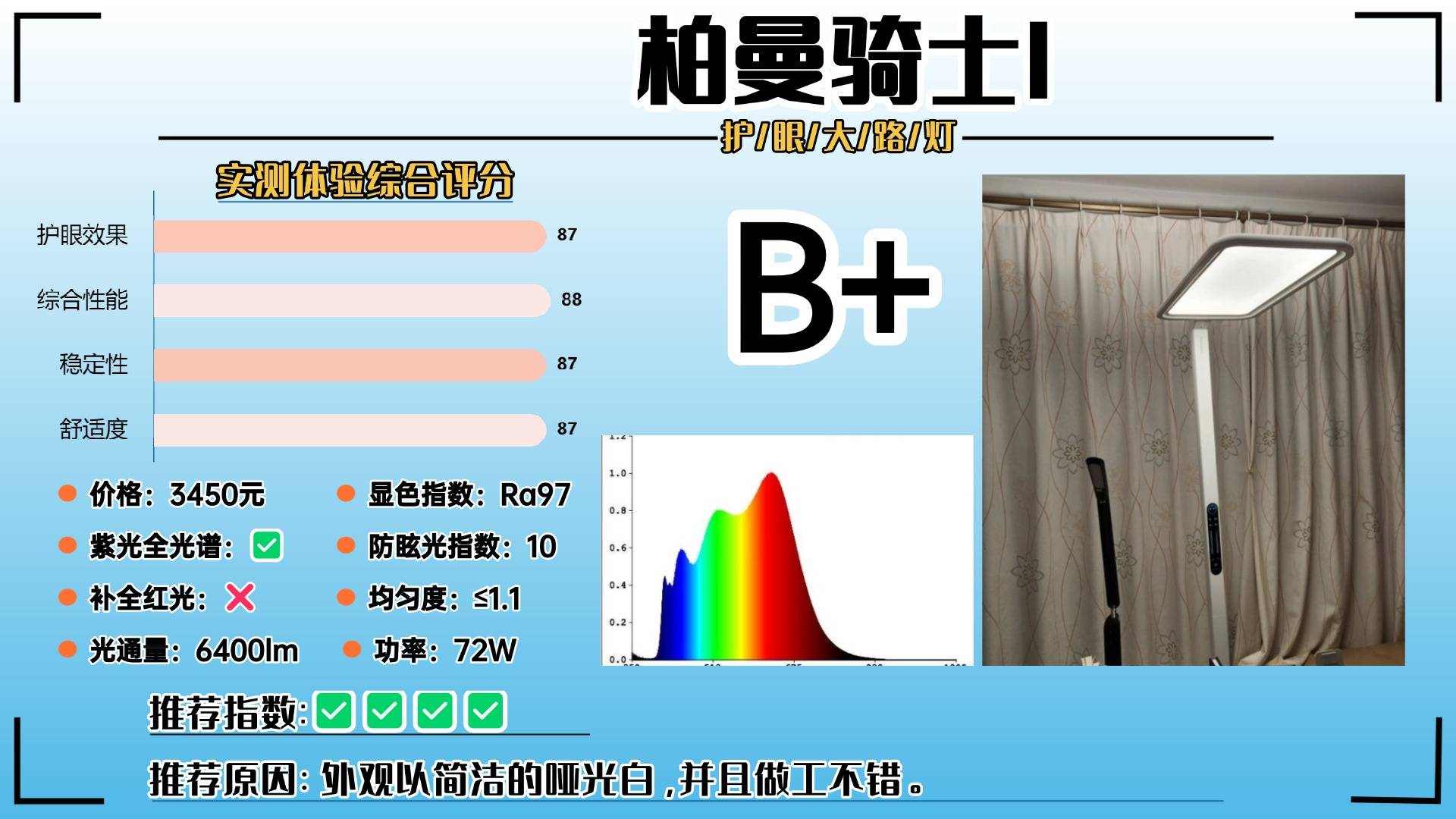 护眼大路灯第九名:柏曼骑士I;外观以简洁的哑光白,并且做工不错。