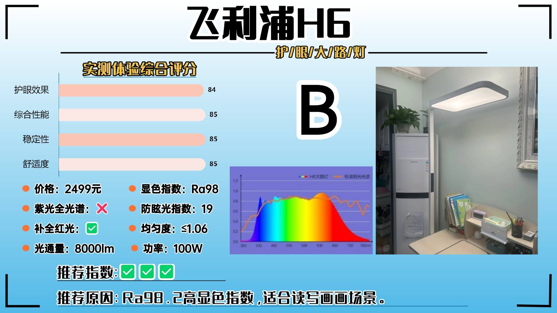 护眼大路灯第七名:飞利浦H6;Ra98.2高显色指数,适合读写画画场景。