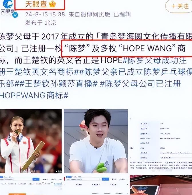 从两人多次撞衫,穿情侣款,到陈梦母亲持股的公司,商标是王楚钦的英文名。