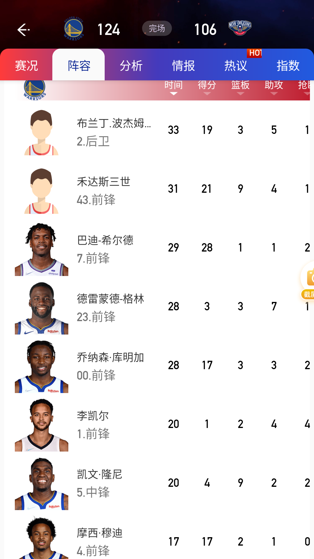 终场比分124-106勇士胜: