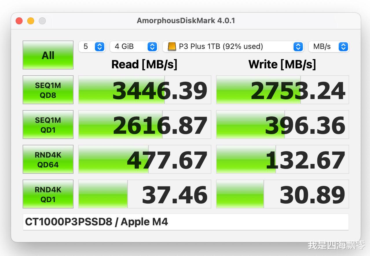 使用AmorphousDIskMark 4.0.1软件对英睿达P3 Plus 1TB固态硬盘进行测试,结果显示其读取速度为:3446.39 MB/s,写入速度为:2753.24 MB/s。