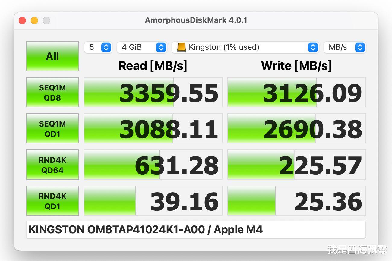 使用AmorphousDIskMark 4.0.1软件对OM8TAP41024K1 - A00 1TB(OEM盘)固态硬盘进行测试,结果显示其读取速度为:3359.55 MB/s,写入速度为:3126.09 MB/s。