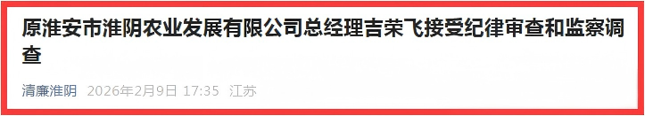 2026年2月9日,一则来自“清廉淮阴”的通报在淮安当地引发广泛关注:原淮安市淮阴农业发展有限公司总经理吉荣飞,因涉嫌严