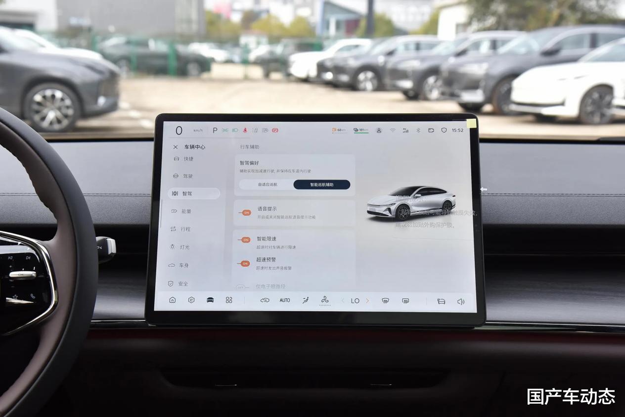 看完了空间,紧接着咱们再来看现在大家买车都很关注的智能化部分,首先智能座舱方面两车表现是都在线的,启源A07 140精英型搭载了长安的天域座舱,给到了15.4英寸中控大屏,以及同级唯一50英寸长距全信息AR-HUD;而秦L 120领先型,则搭载了DiLink100智能座舱,配置上给到了12.8英寸中控大屏。功能方面两车差距不大,像是在线导航/音乐、手机车机互联、手机APP控车、语音识别控制等功能两车都有配备,只不过启源A07 140精英型得益于高通8155芯片更高算力,以及更大尺寸中控屏、AR-HUD的加持,科技感和车机流畅度表现相对来说确实要好一些。