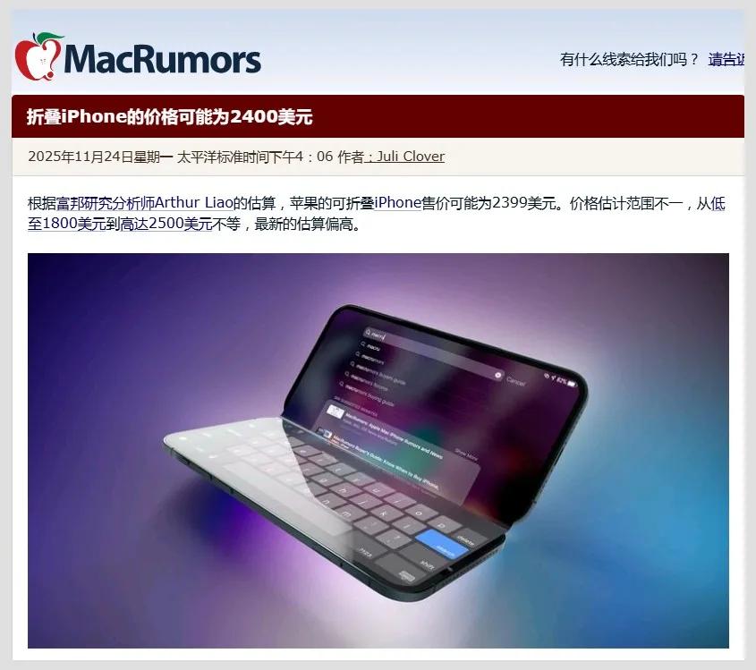 然而,富邦研究在最新报告中则表示,折叠屏iPhone的售价或将达到2399美元(约合人民币1.7万元起)。