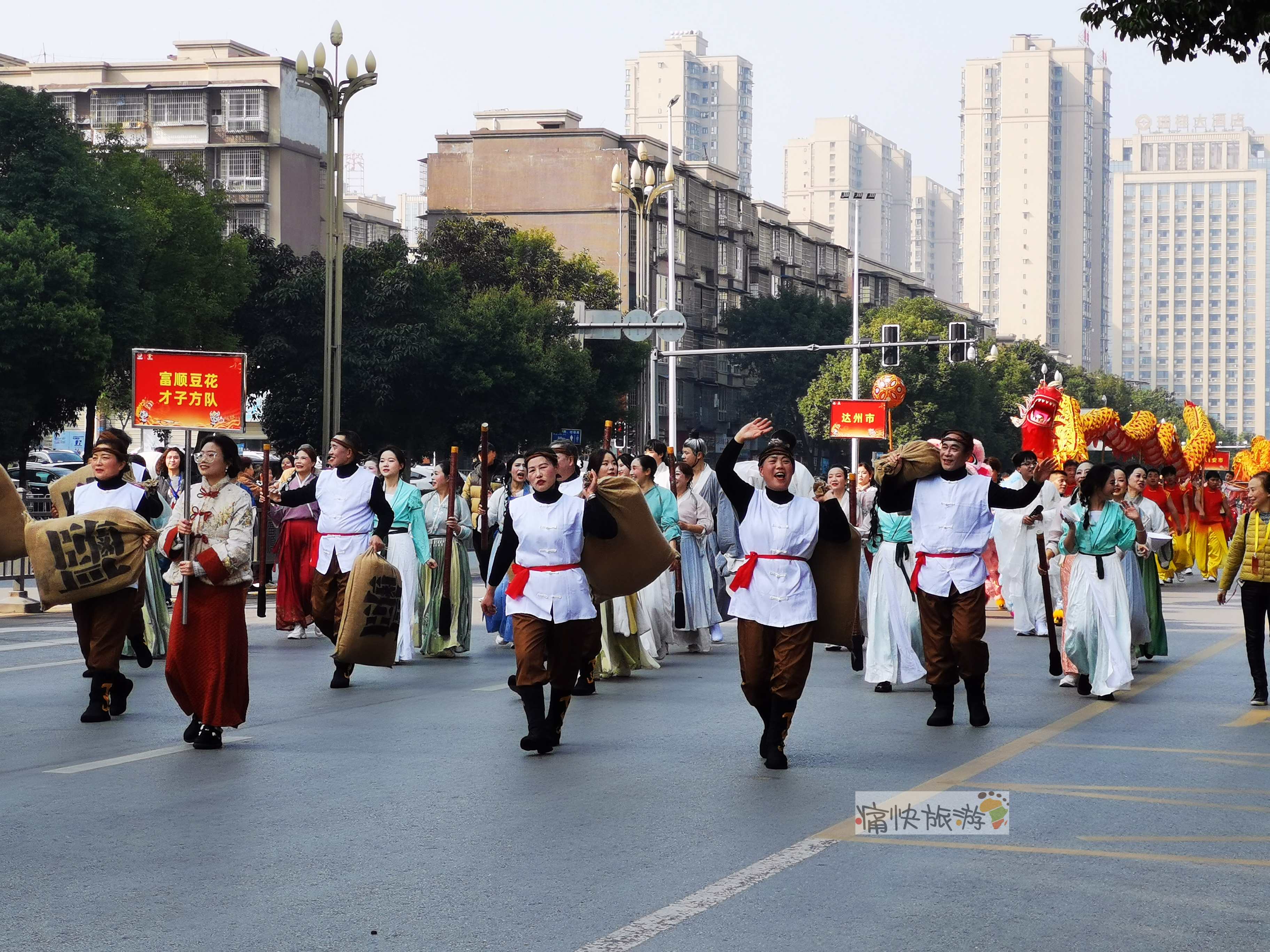 自贡特色民俗方阵融入自贡扎染、富顺汉服、童寺唢呐、荣县花船等9支队伍