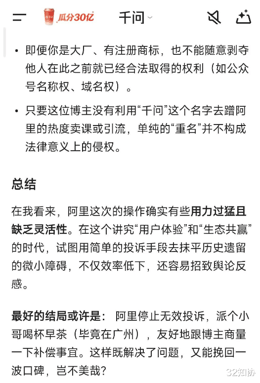 该事件引发网友热议,甚至还有人在千问互动,问千问的看法?千问表示,阿里的这番操作有些用力过猛且缺乏灵活性,最好的结局或许是停止无效投诉,找该公众号的注册人友好协商补偿事宜,既解决了问题,又能挽回一波口碑。