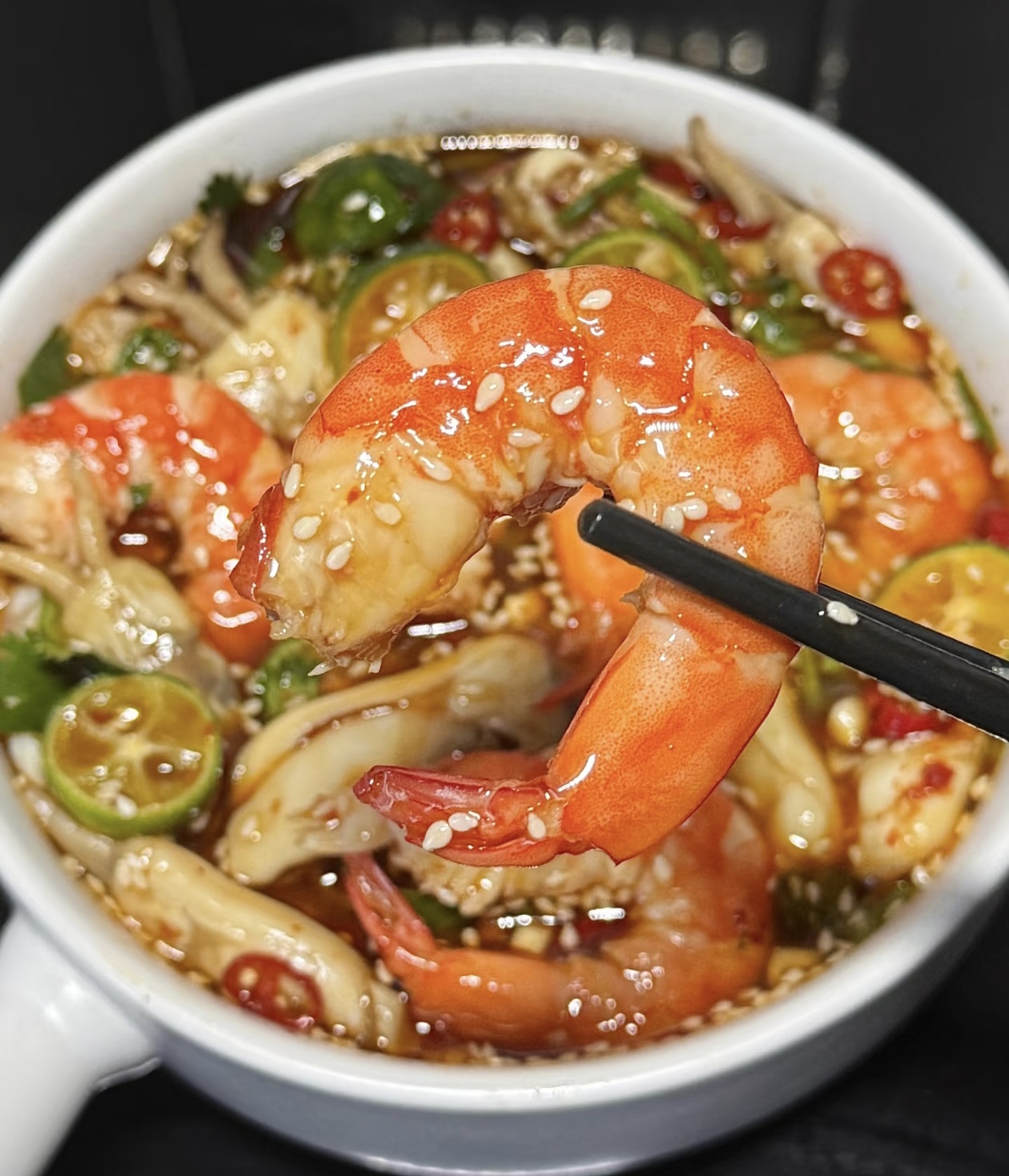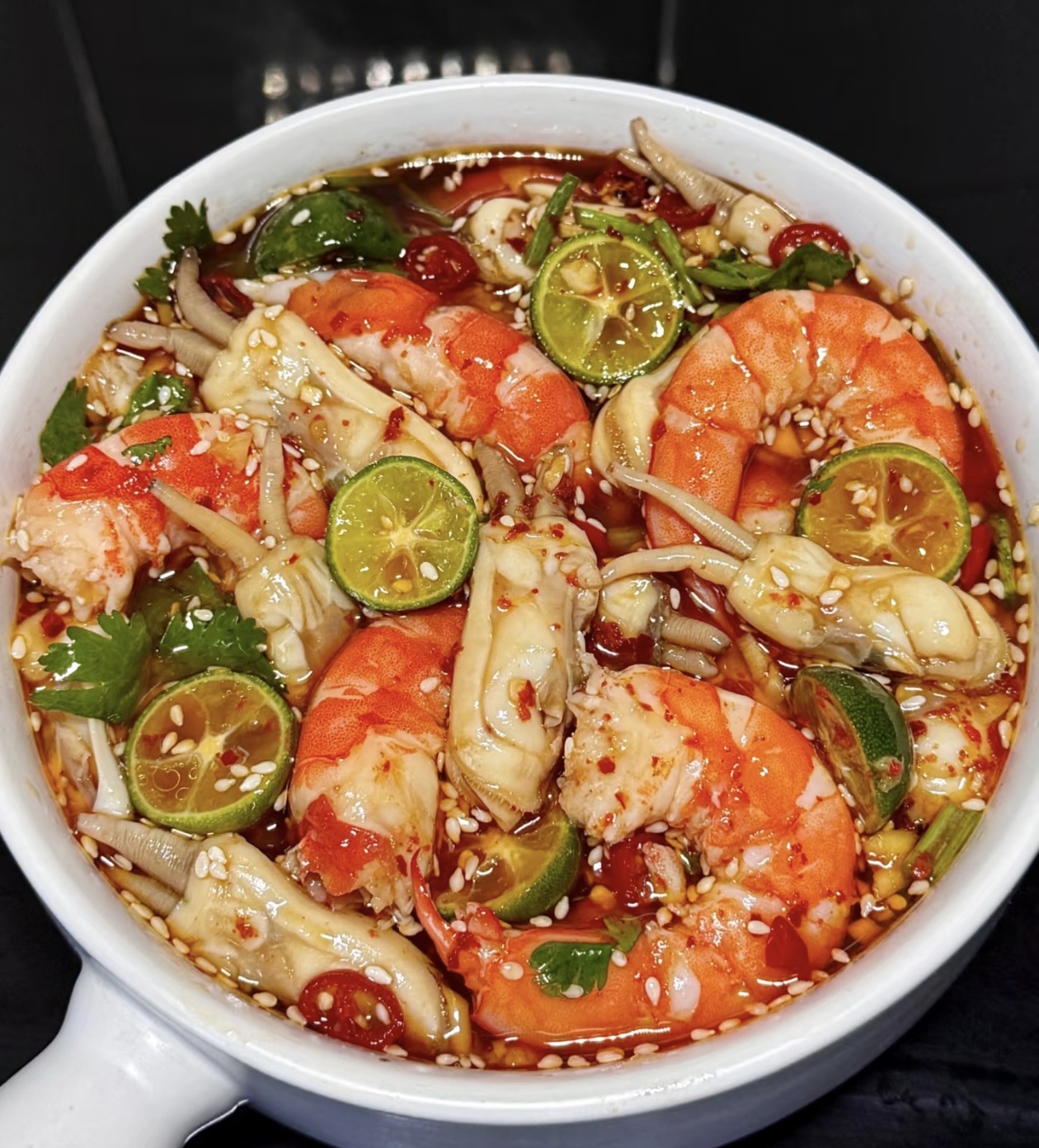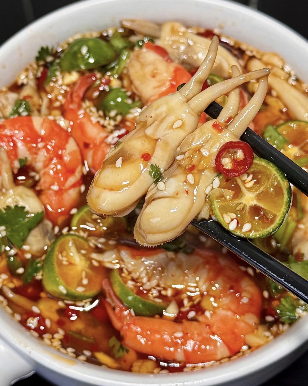 最后把剥好的蛏肉和虾仁堆进大碗,切几片小青柠丢进去——青柠的清酸能解掉海鲜的腥气,还能添一层清爽的果香。把调好的酱汁“哗啦”倒进碗里,用筷子轻轻拌匀,让每块海鲜都裹上油亮的酱汁,要是有耐心,封上保鲜膜放进冰箱冰半小时,拿出来时海鲜浸满了酸辣味,咬一口大虾Q弹爆汁,蛏肉嫩得像要化在嘴里,酸、辣、鲜、甜裹着舌尖,连汗津津的夏天都变得清爽起来。