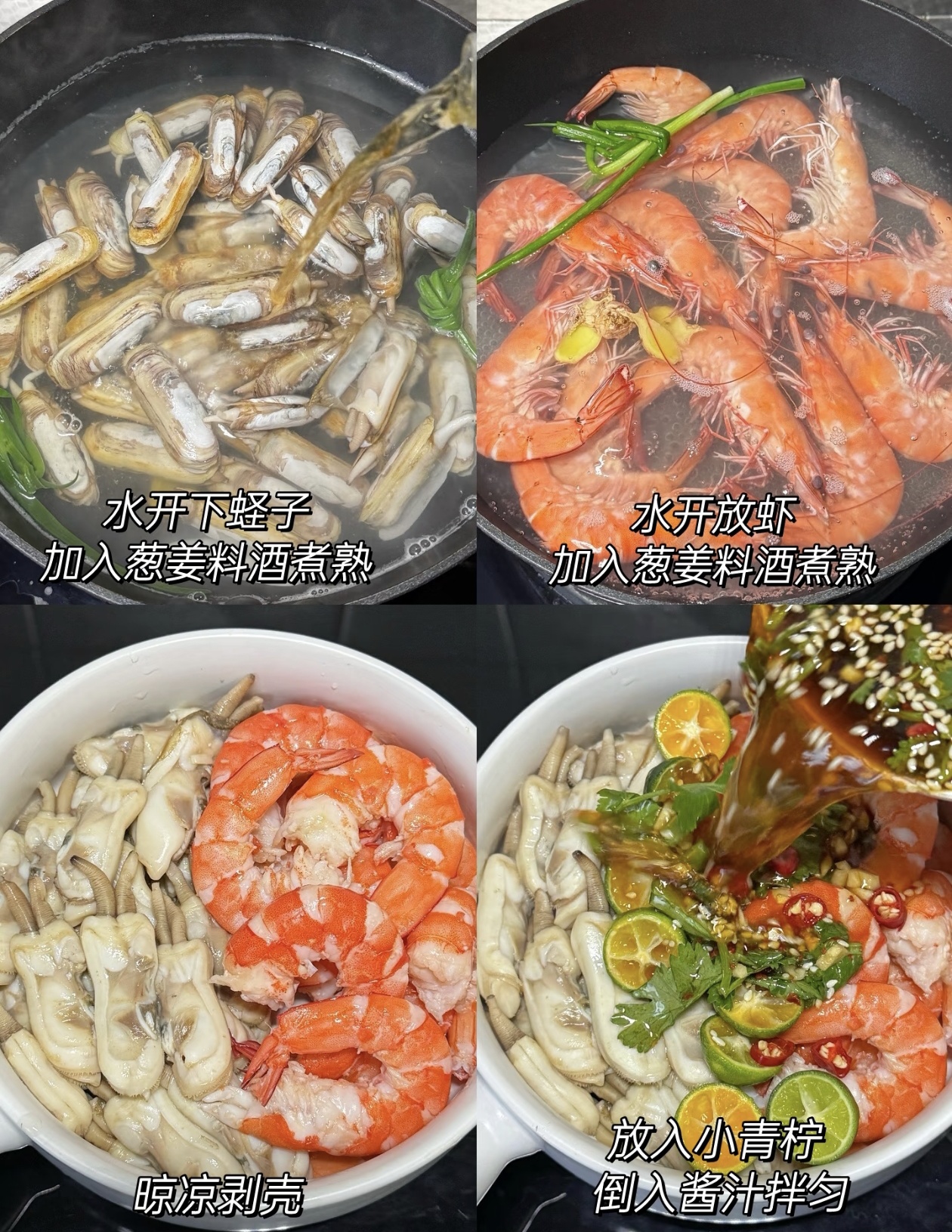 海鲜的处理更是简单到没门槛:水烧开后先下蛏子,丢几片姜、淋一勺料酒,等蛏子“啪”地张开壳,捞出来过凉水,剥壳时能摸到蛏肉滑溜溜的嫩;接着下大虾,同样加葱姜料酒煮到变红蜷起,捞出来晾到不烫手,剥壳时要留着虾尾那点红壳,摆进碗里看着就鲜亮。