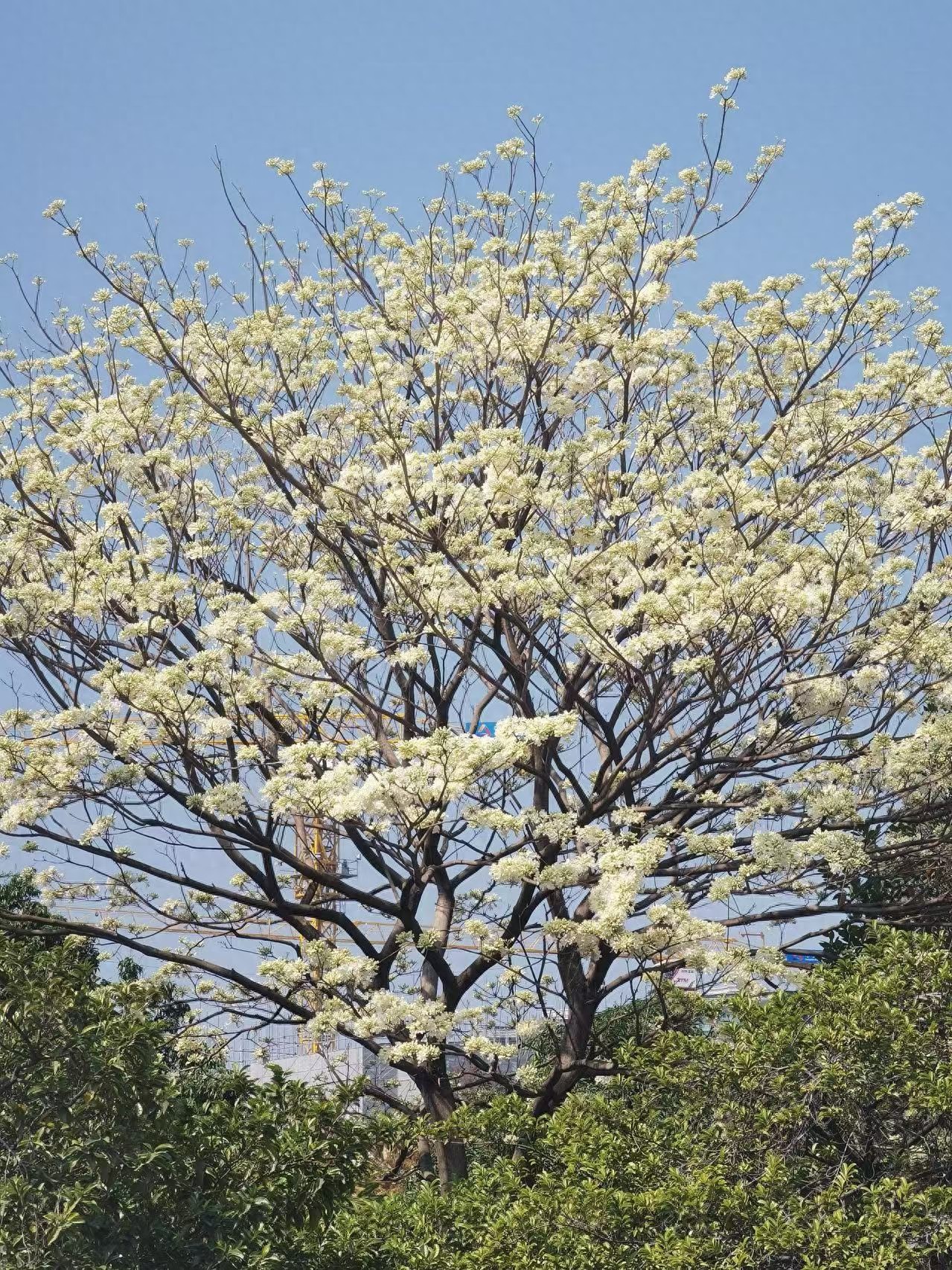 不同于常见的黄花风铃木和紫花风铃木,余荫山房内的白花风铃木是华南地区较为罕见的园艺品种,园内仅有一株,每到春日便成为园区最亮眼的景致,吸引众多游客慕名而来打卡。据了解,这株白花风铃木树冠呈伞状,盛花期时整树无叶,洁白的花朵簇拥枝头,呈铃铛状,花管喉部泛着淡淡的黄色,与纯白花瓣相映成趣,远远望去如堆雪覆枝、似流云栖梢,微风拂过,花枝轻摇,宛如一串串风铃低语,氛围感十足。
