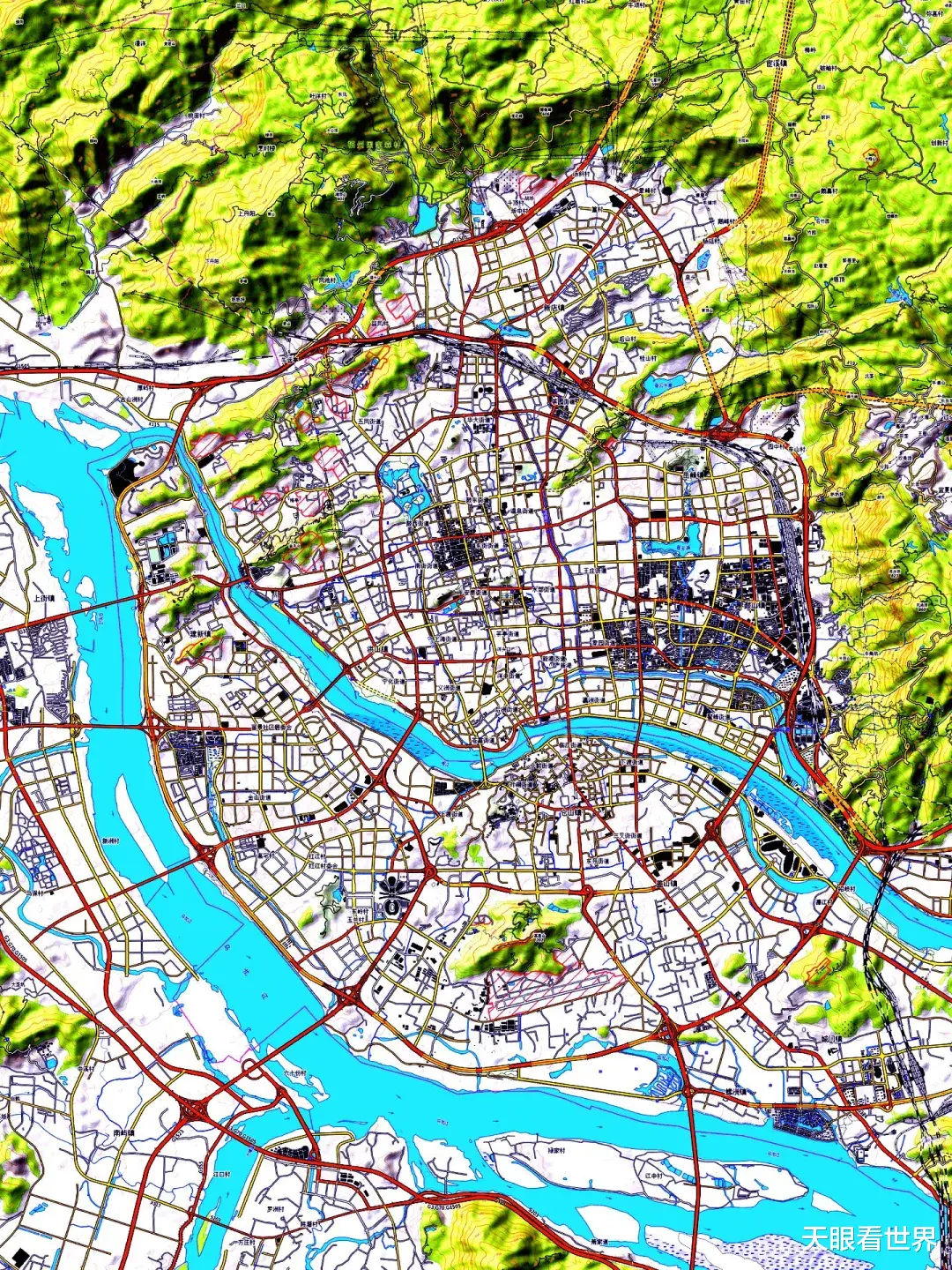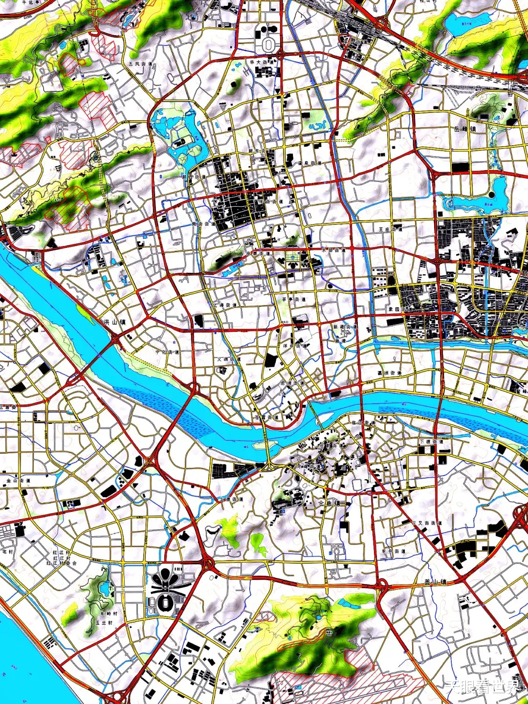 在以上双重约束下,城市内部的道路组织呈现出高度的系统性。在河流分割形成的各个相对平坦的区块内部,道路网络普遍呈现清晰的网格状分布。这种棋盘式格局是提高土地利用率、优化交通组织效率的理性选择。网格由不同等级的道路构成,形成层级分明的交通骨架。主干道路贯穿各主要区块,次级道路则填充其间,共同构成一张覆盖建设区域的密集网络。