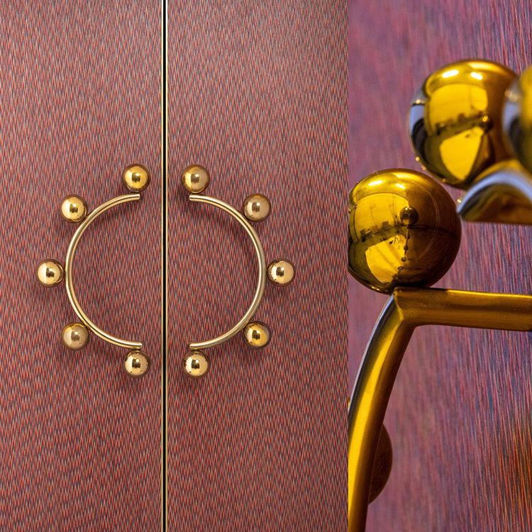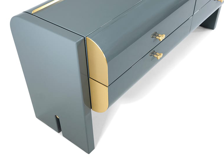 抽屉上有卷曲的圆弧和明亮的金属细节首饰。