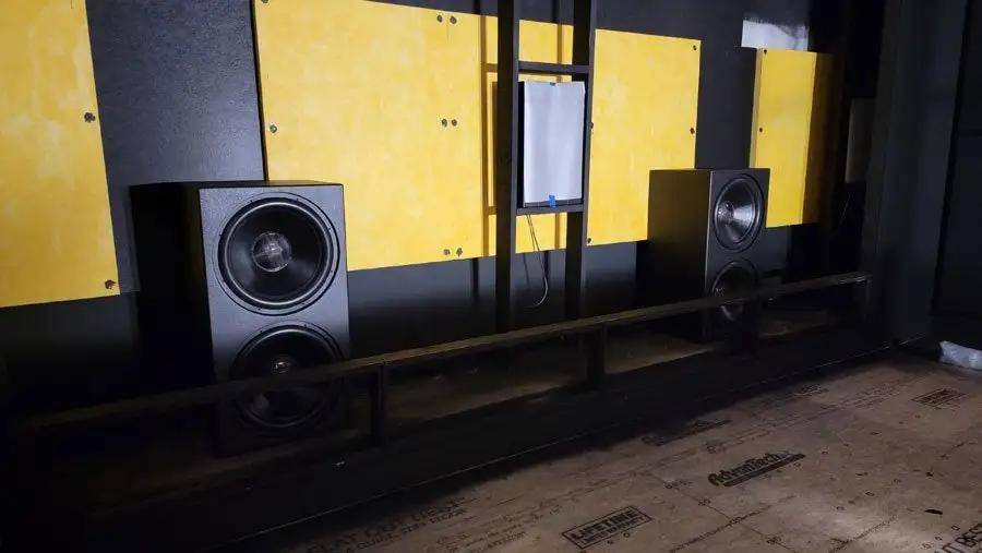 “除了‘房中房’设计外,我们还在天花板横梁和所有墙壁之间使用了双层 5/8 英寸(约 1.59 厘米)的石膏板,并在其中加入 Green Glue,使用 IB-1 剪力钉和龙骨通道用于墙壁和天花板,在所有空腔中填充 R19 保温材料,安装悬浮地板,在舞台上使用沙子和锯末的混合物,并为影院和投影机房配备了带有柔性风管的专用暖通空调单元,用于供应和回风。”