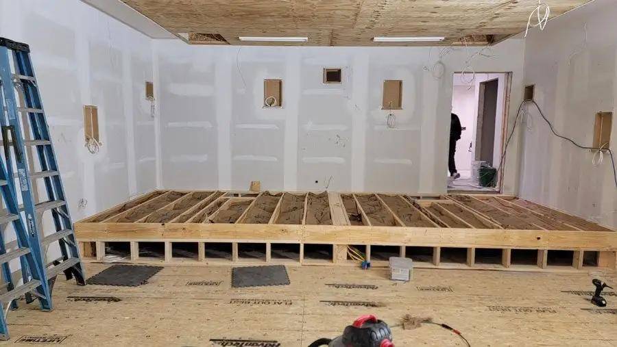 墙壁木地板地板木材天花板,所有墙壁和天花板都安装了龙骨通道,以隔离石膏板与框架。