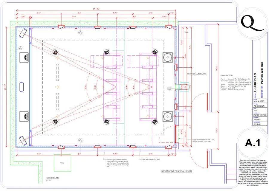 “Shawn Byrne(@SierraMikeBravo)和 Sharon Faier 在 Quest Acoustical Interiors 设计了影院,QuestAI 总裁 Gerry Lemay(@AudioGuru)进行了预建声学分析。总承包商是密苏里州西南部的当地定制建筑商 Mark Martin。Creative Audio 负责整个房子的布线和预埋,以及 Control4 编程,Adam Pelz(@appelz)进行了音频和视频校准。”