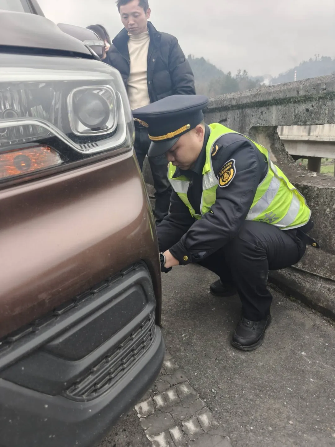 正值春运车流高峰期,路面车流量较大,为避免二次事故,执法人员立即分工协作展开救援:一组人员在故障车后方规范设置安全锥,实施现场渠化,引导后方车辆提前减速避让;一组执法人员将司乘人员引导至安全区域,帮助驾驶员换胎。
