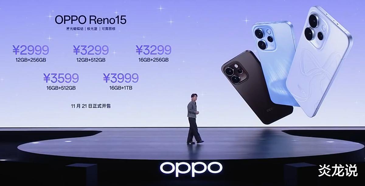 价格与发售信息Reno15 Pro定价3699元(12GB+256GB)、3999元(12GB+512GB)、4299元(16GB+512GB);Reno15提供2999元(12GB+256GB)、3299元(12GB+512GB/16GB+256GB)、3599元(16GB+512GB)、3999元(16GB+1TB)多个版本。全系于11月21日线上线下同步开售,后续将推出入门款Reno15c,延续系列设计语言与实况功能基础体验。