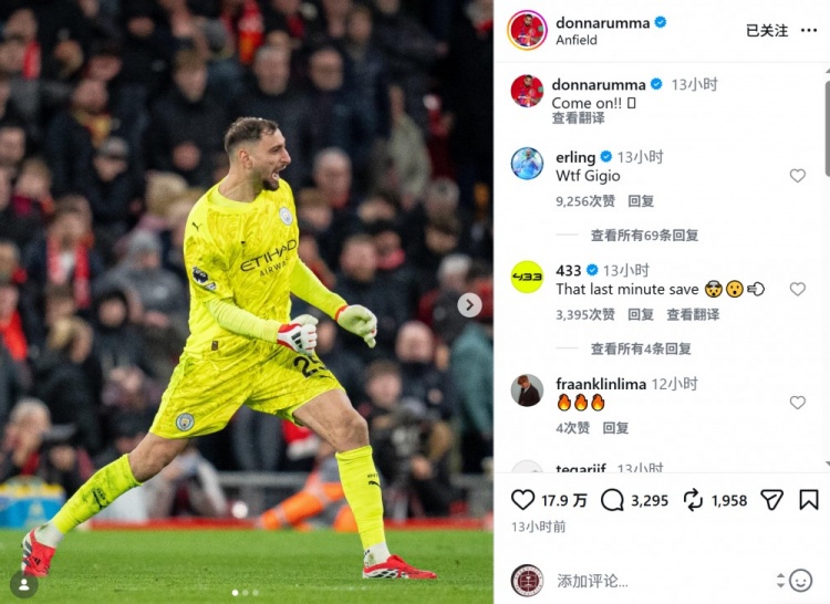 英超第25轮,曼城客场2-1击败利物浦,多纳鲁马以终场前的神扑改变比赛走势,让见多识广的瓜迪奥拉和哈兰德也瞠目结舌。