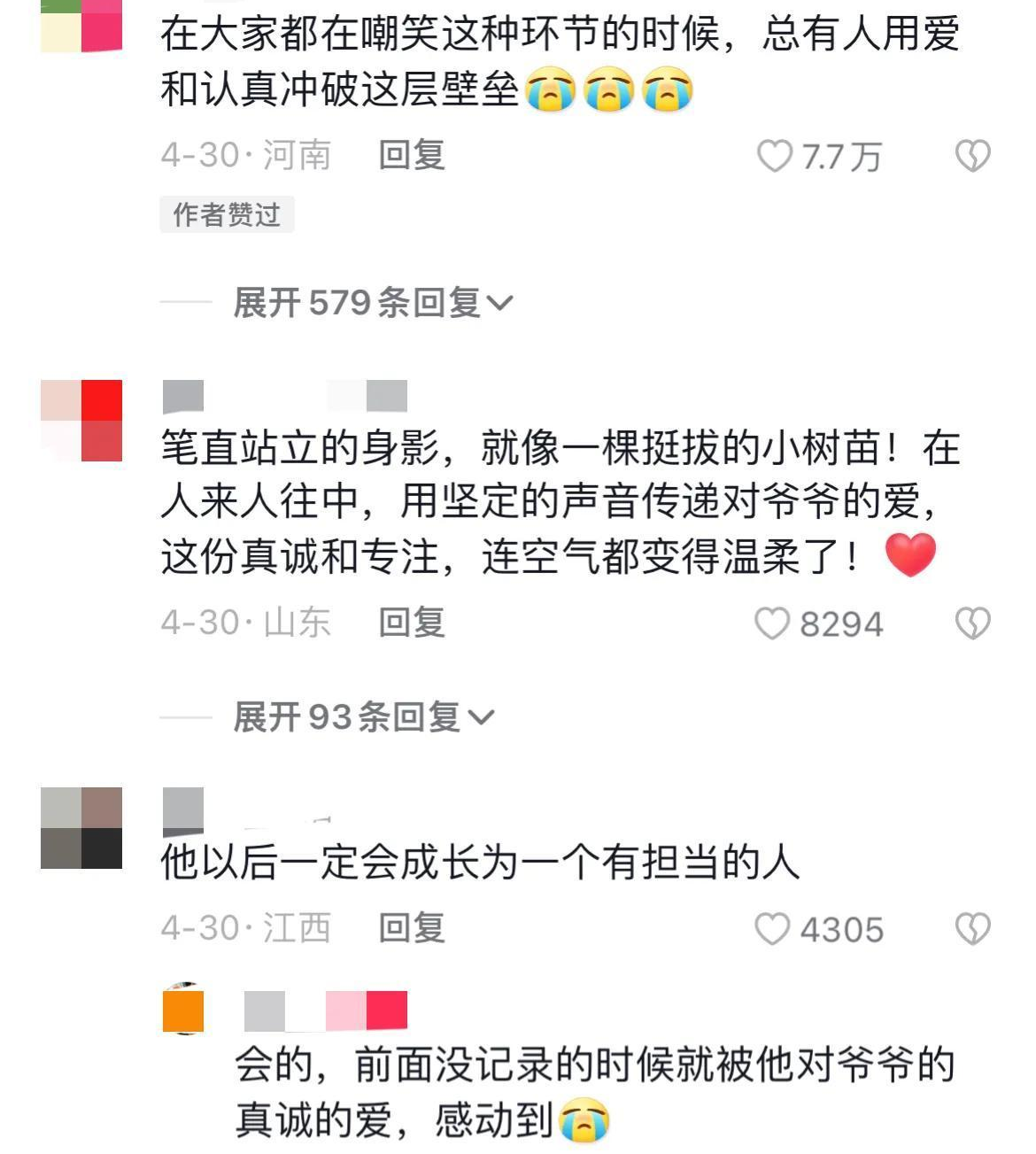 他认真拥抱了自己的爷爷,对爷爷深深表达感谢,并拿出了自己提前给爷爷写的一封信念给爷爷听。