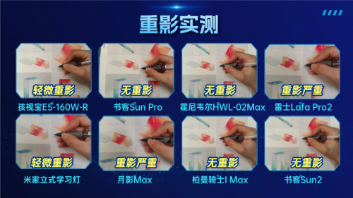 测试四:重影表现重影现象会影响视觉的清晰度和舒适度,使物体看起来出现多个虚影,增加眼睛的调节负担,容易导致视觉疲劳。在书写和阅读过程中,重影会干扰视线,眼睛得不停聚焦才能看清,降低学习效率,因此重影表现也是评估护眼大路灯性能的重要方面。