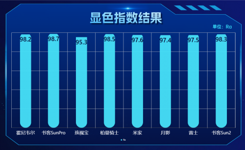 这三款产品显色表现良好,月影Max(Ra97.4)、雷士Lafa Pro2(Ra97.5)和米家立式学习灯(Ra97.6)的显色指数接近98,能较好地还原大多数色彩,虽然略逊于第一梯队,但对于普通阅读和学习使用完全足够。