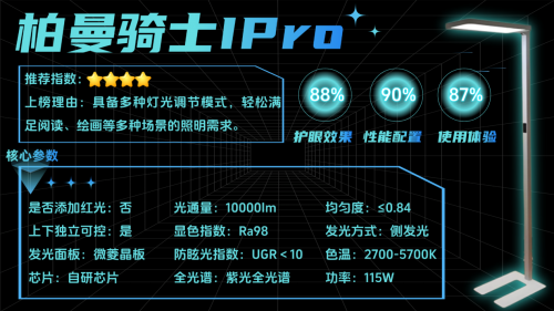 柏曼骑士I Max凭借微菱晶板折射技术,光线经多次散射后均匀分布,防眩光指数UGR<10,同样保持在无眩光范围内,满足专业级护眼需求。